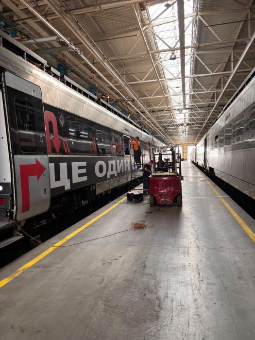 Внаслідок ворожого нічного обстрілу Києва у пункті базування зазнав пошкоджень поїзд Інтерсіті+, на бортах якого - робота всесвітньо відомої американської художниці Барбари Крюгер "Без назви (Ще одне знову)", присвячена українцям.