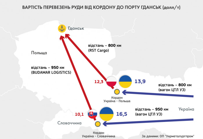 Перевезення руди у вагоні ЦТЛ УЗ територією України на відстань у 950 км до кордону з Словаччиною коштуватиме 16,5 доларів за тонну, тоді як транспортування вагонами BUDAMAR LOGISTICS за аналогічну відстань по території Словаччини та Польщі до порту Гданськ коштує 10,1 доларів за тонну.