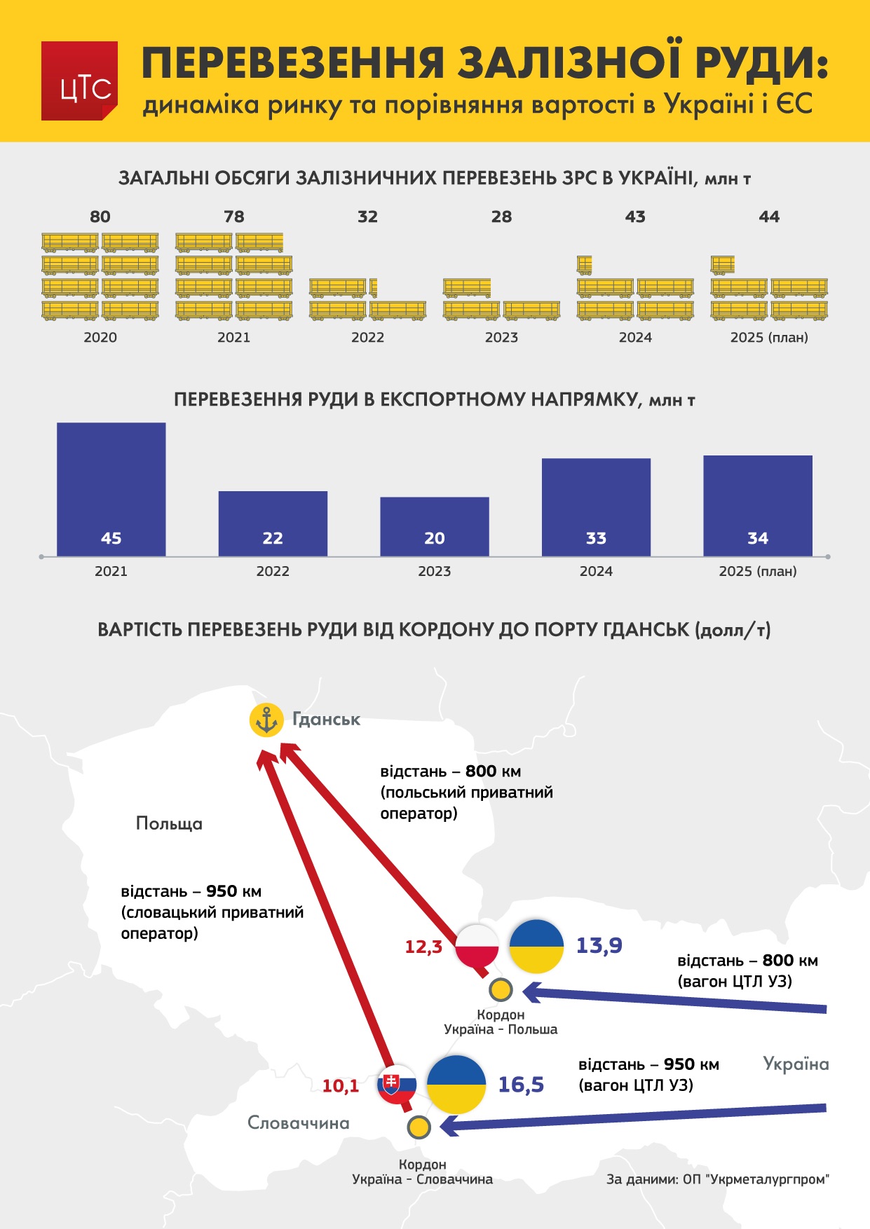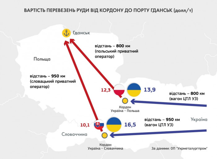 Вартість перевезення залізної руди у вагоні ЦТЛ УЗ територією України до кордону з Польщею коштує 13,9 доларів за тонну, в той час як вартість перевезення польським оператором за аналогічну відстань у 800 км вже по території Польщі до порту Гданськ коштує 12,3 доларів за тонну.