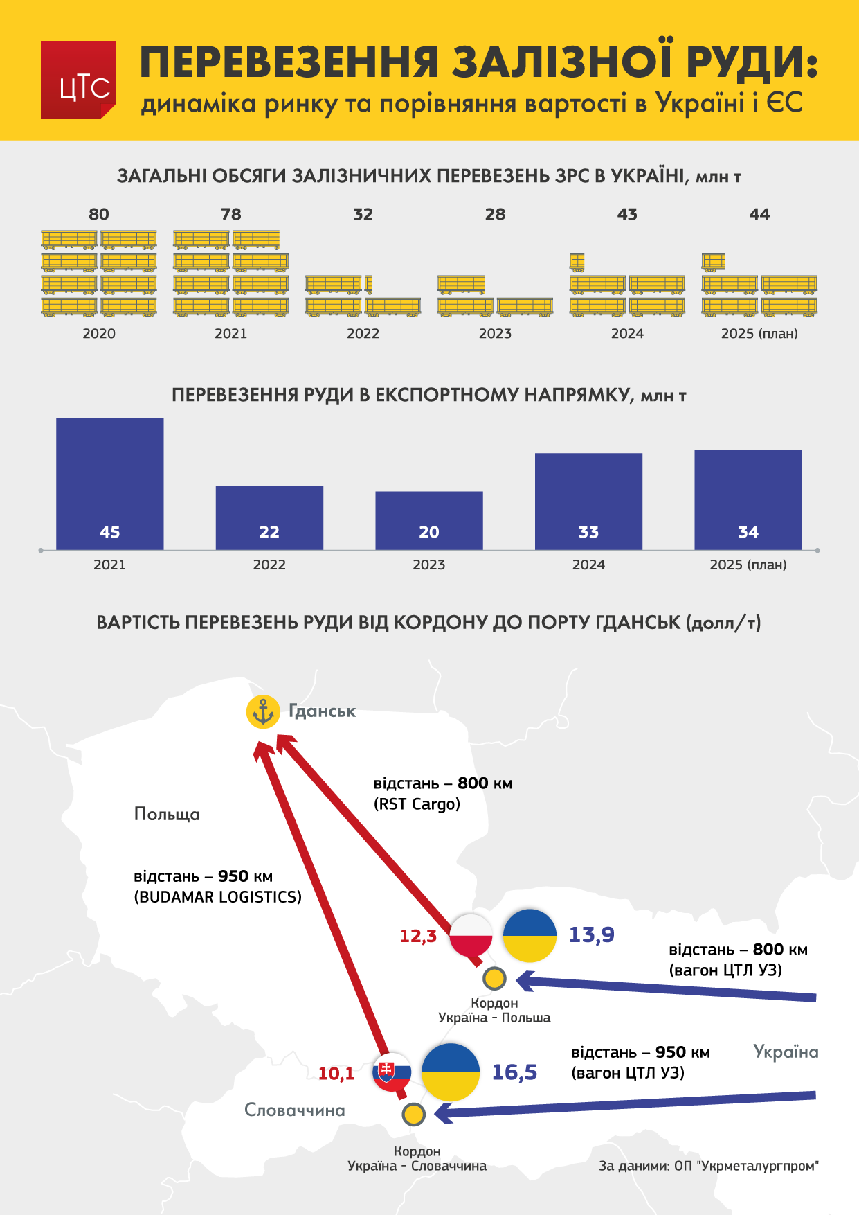 Вартість перевезення залізної руди у вагоні ЦТЛ УЗ територією України до кордону з Польщею коштує 13,9 доларів за тонну, в той час як вартість перевезення вагонами RTS Cargo за аналогічну відстань у 800 км вже по території Польщі до порту Гданськ коштує 12,3 доларів за тонну.