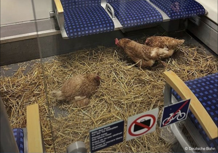 Як пише ЦТС з посиланням на німецькі ЗМІ, невідомі особи перетворили купе на невеликий курник, розсипавши солому на підлозі. Очевидно, птахи знаходилися в купе протягом усього маршруту і були помічені машиністом лише на кінцевій станції.