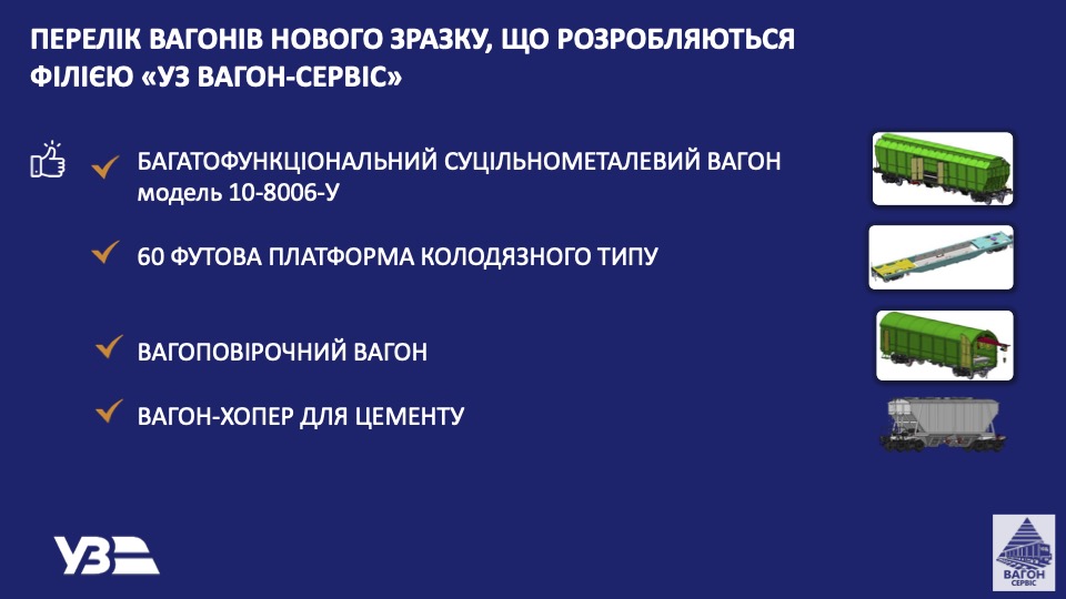 Зокрема, у філії розробляють 60-футову платформу колодязного типу, вагоповірочний вагон та вагон-хопер для цементу збільшеного об’єму.